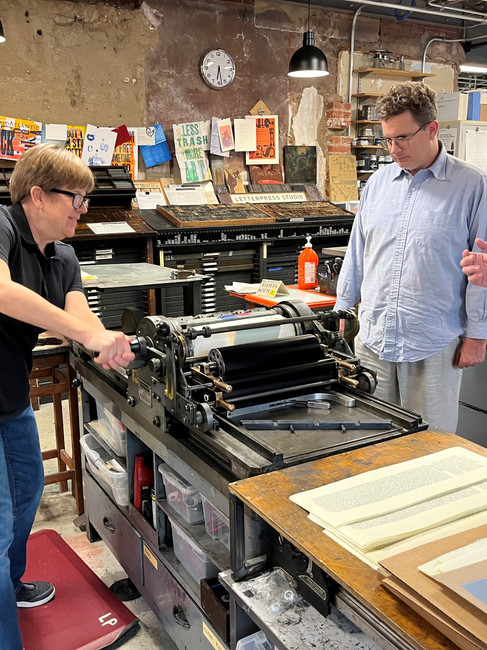 The custom plate was stuck on a special metal base in the bed of a 20th-century press in the printing studio at Pyramid Atlantic Art Center in Hyattsville, and the inked image was pressed onto blank laid paper just like an 18th-century broadside. Ben, along with interpreters Sean Lowman and Philip Hosea, worked to print the broadsides. Interpreter Diane Rey (who portrays Mrs. Green for HA) joined the printing team to assist, too!