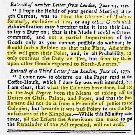August news from Philadelphia quoted three London letters from June. The first writer said that Parliament’s incomplete reversal on the Townshend Duties “left us here in a Kind of Suspense, and turned our Eyes to the Conduct of the Americans.” Enemies of America predicted that even Bostonians would welcome British imports as the boycott agreement fell apart, but they were shocked when the ships returned with their cargoes still on board. English “Friends of America rejoiced openly over their Enemies” and hoped that Virginia shipments would also be rejected. If Americans only held firm, Parliament would surely repeal the tea tax in the coming winter.